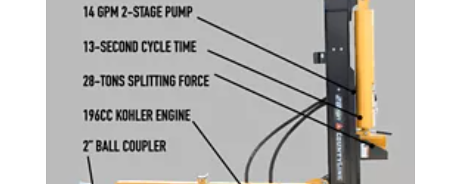 The CountyLine 28-Ton Log Splitter uses a 196cc Kohler SH270 Series engine, which is known for having both industry-leading power and a user-friendly design. Featuring 6.5HP, 10.2 FT-LBS of Torque, 13 Second Cycle Time and a 14 GPM 2-stage pump this engine is sure to perform under the toughest of challenges. The Kohler has an accessible air filter and spark-plug, making it extremely easy to maintain, and a dual ball bearing crankshaft design that makes starting up a breeze.