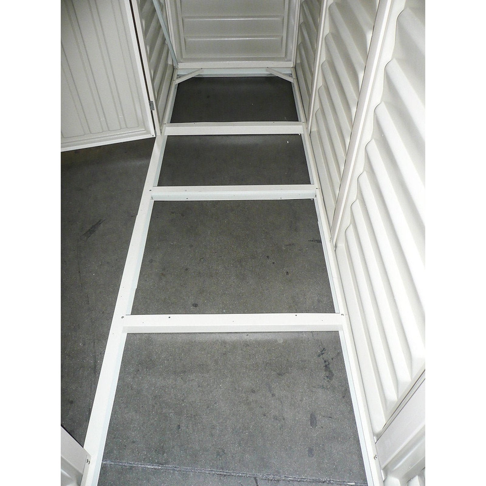 Part of the Woodbridge series, DuraMax Sheds now offers a new 10.5′ x 2.75′ vinyl shed for smaller storage needs. The new shed gives you the ultimate solution for storage in long slim areas! Shopping for a new shed can be tedious; there is no better value out there if you desire a real vinyl shed! This massive shed offers tall walk-in, extra wide double doors. Built with heavy duty wall columns with steel reinforcements to add superior strength, strong enough to hang garden tools on or build shelves with ease. This extra long shed provides a unique solution for odd spaces. Use along side your house, fence or even get organized inside for garage and basement storage closet needs. *plywood flooring pictured not included
