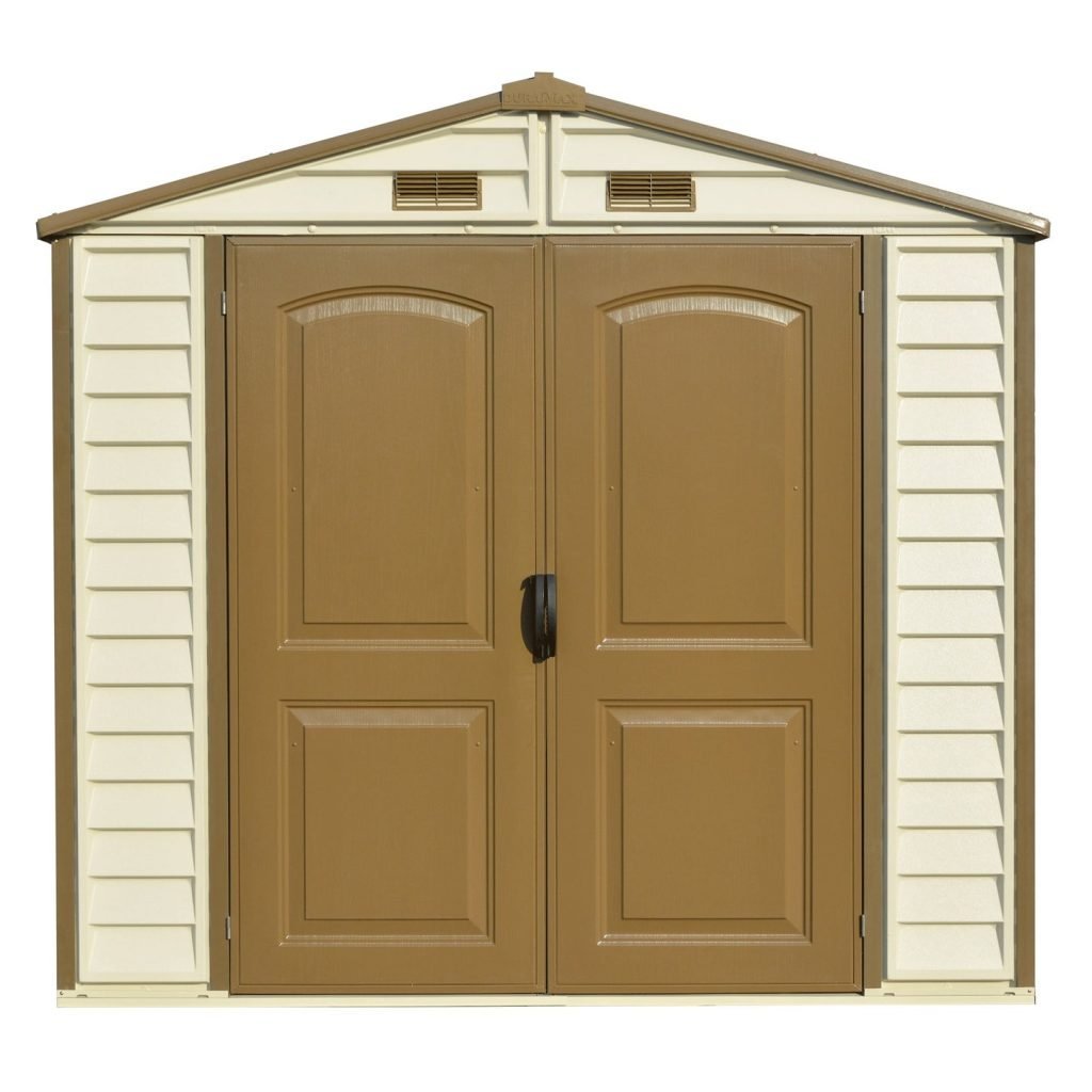 DuraMax Sheds now offers a new line of 8-foot premier vinyl sheds with their signature series. The new series gives you the ultimate solution for any storage needs! If you have enough space to fit this large 8×6 shed in you’ll add over 240 cubic feet of storage capacity to your backyard. Shopping for a new shed can be tedious; there is no better value out there than our StoreAll sheds if you desire a real vinyl shed! The StoreAll shed offers tall walk-in, extra wide double doors and is built with heavy duty wall columns with steel reinforcements to add superior strength, strong enough to hang garden tools on or build shelves with ease. The 8′ wide size is a perfect fit for most backyards or patios. The roof, trim and doors are accented brown which will compliment almost any surrounding.