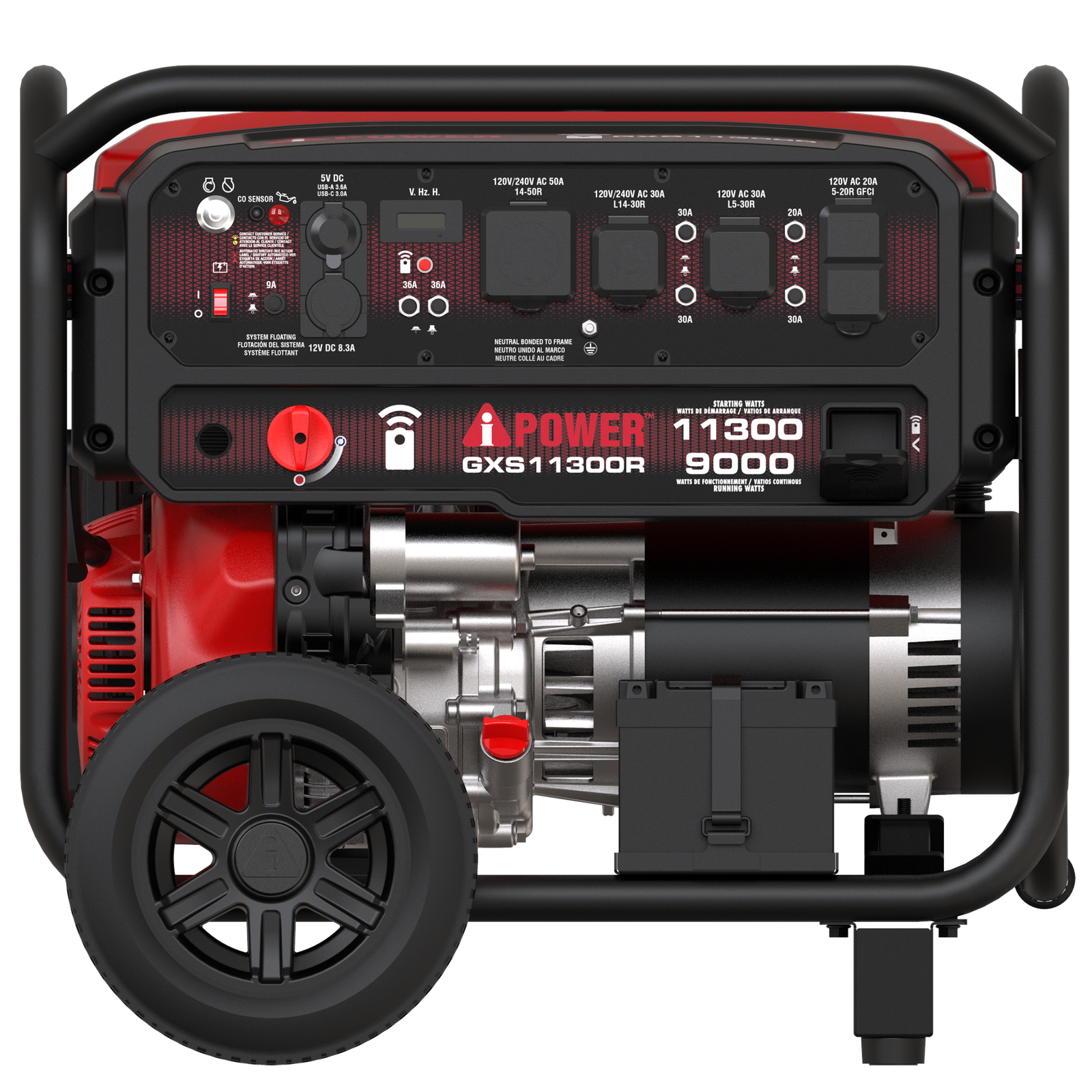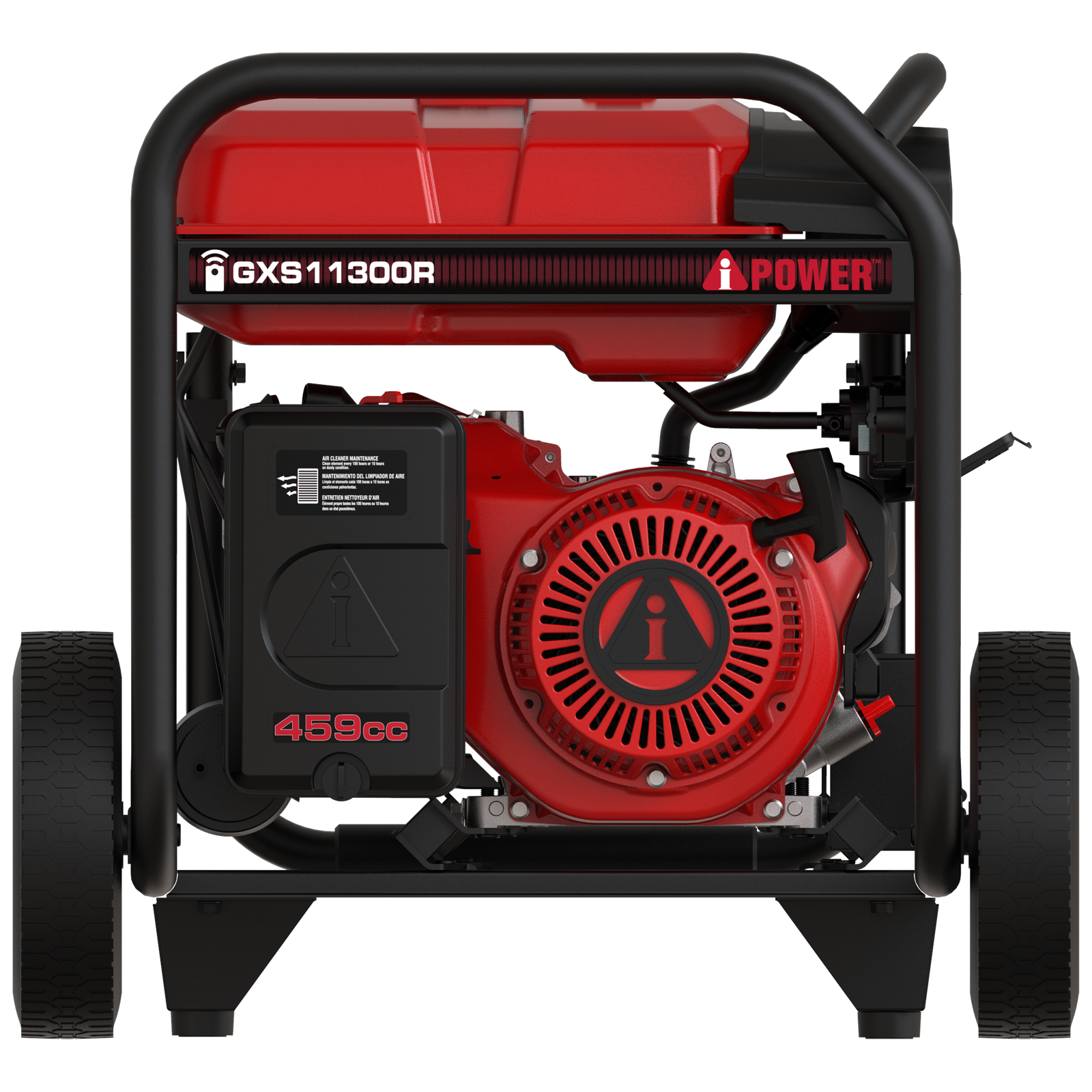 Featuring a 459cc OHV engine with cast iron sleeve and low oil shutdown, the GXS11300R Remote Control Portable Generator has 11,300 starting watts and 9,000 running watts on gasoline. The 9.5-gallon fuel tank provides an extended run time of up to 18 hours at 25% load. It offers simple starting through recoil, electric, and remote start, plus a battery and fob is included.