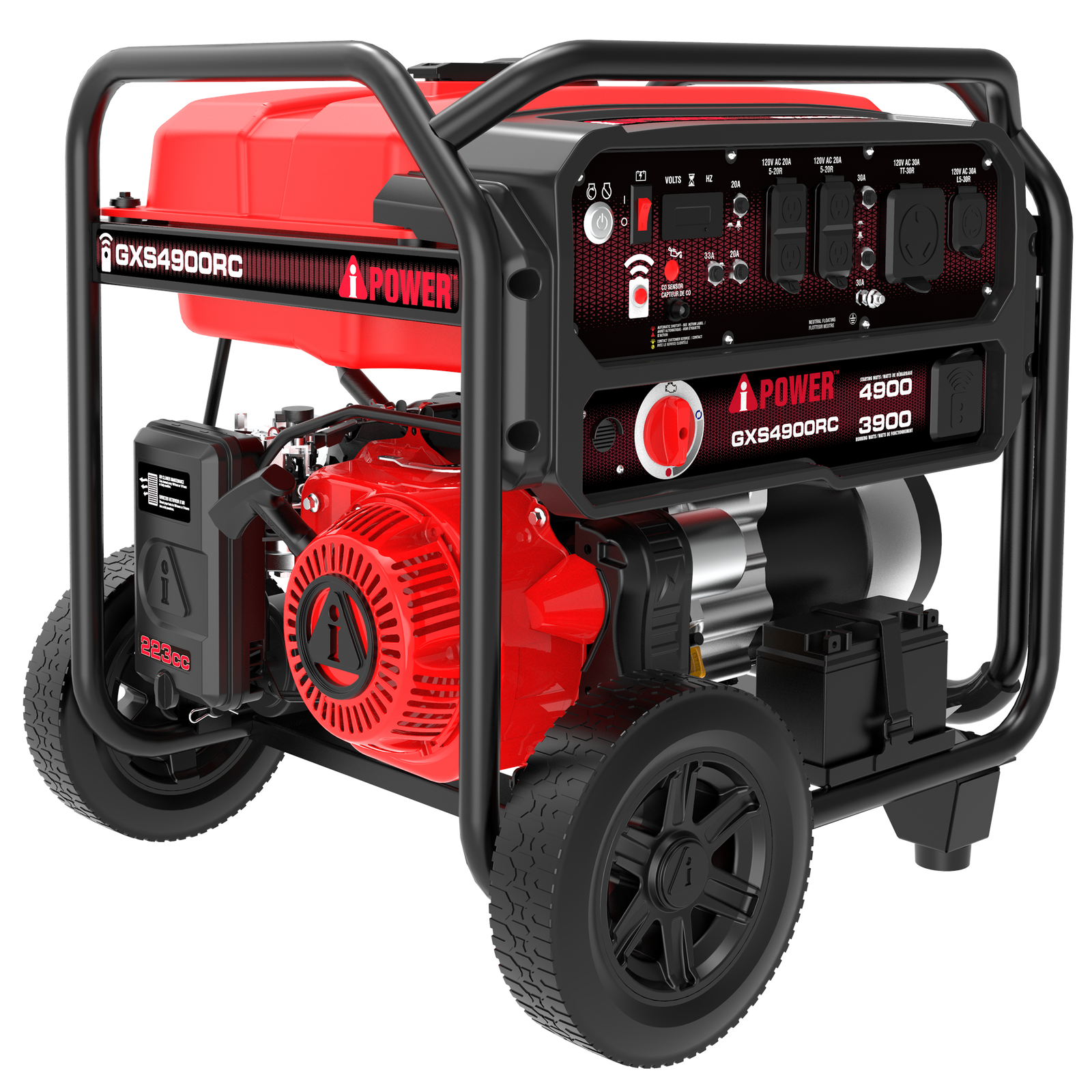 Powered by a performance series 223cc OHV engine with cast iron sleeve and low oil shutdown, the A-iPower Remote Control Generator has 4,900 starting watts and 3,900 running watts. The 6.3-gallon fuel tank offers extended run time of up to 20 hours at 25% load.