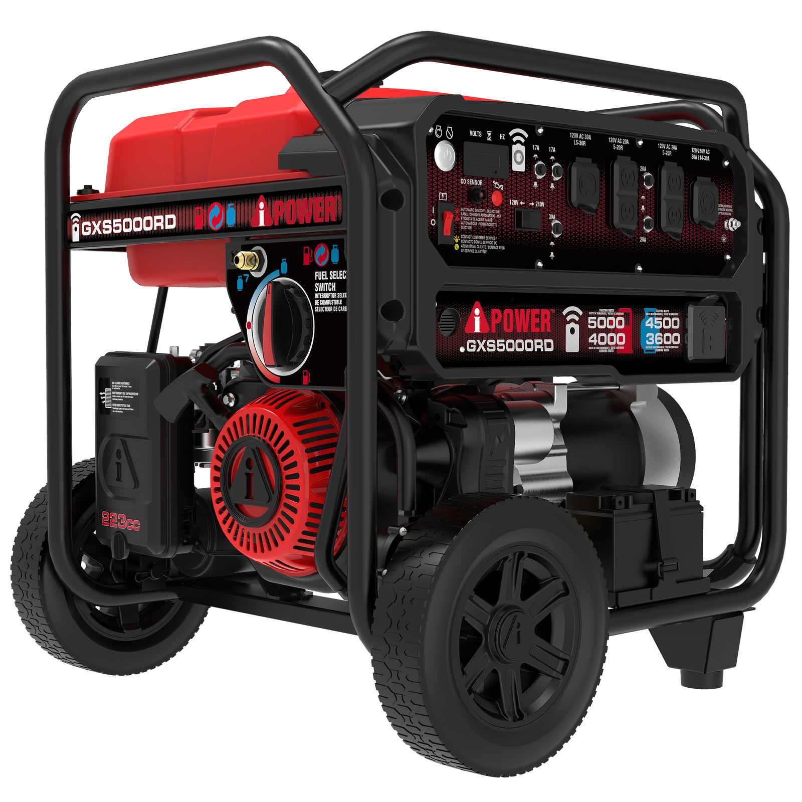 Featuring a 223cc OHV engine with cast iron sleeve and low oil shutdown, the GXS5000RD Remote Dual Fuel Portable Generator has 5,000 starting watts and 4,000 running watts on gasoline and 4,500 starting watts and 3,600 running watts on propane. It offers simple starting through recoil, electric, and remote start, plus a battery and fob is included.