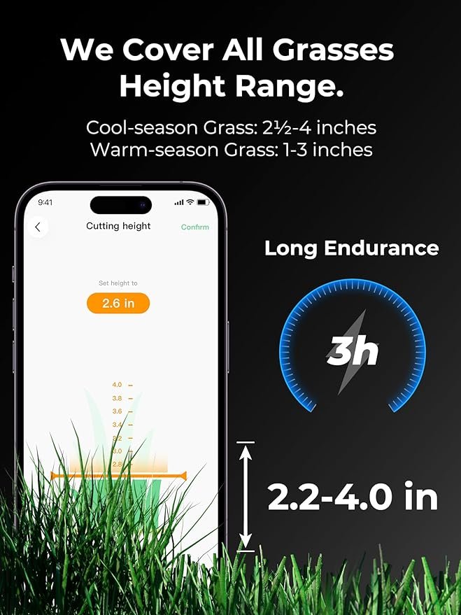 - RTK+Vision Integration, A trust Choice for Complex and Terrain: With enhanced RTK signal coverage and 3D vision positioning technology, places with weak signals or hefty trees coverage is no more a problem. LUBA 2 AWD 3000H All-Wheel Drive automatic robot lawn mower can navigate narrow passages, objects and slopes, handling slopes of up to 80%/ 38-degrees, cuts at a max height of 4 inches, and covers up to 3,767 square feet per hour, perfect for lawns that up to 0.75 acres.