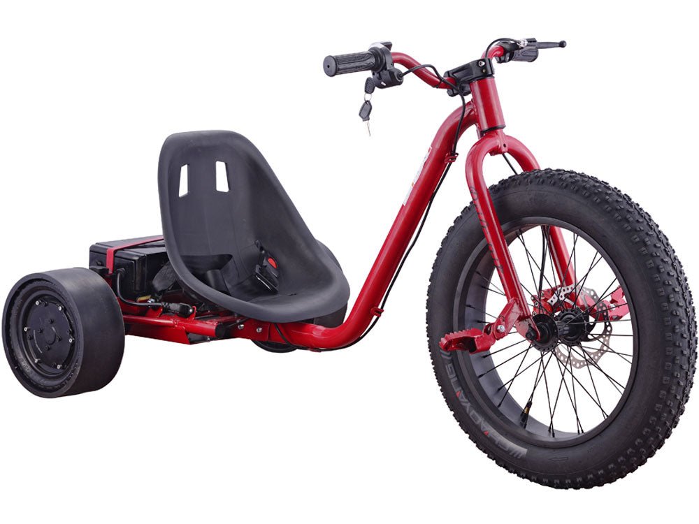 The New MotoTec DT900 Motorized Drift Trike delivers high power and speeds for the ultimate drifting ride. Powered by 2 hub motors in the rear wheels, 3 large 12v 12ah batteries and reaches speeds of 15 mph. Features include: large front tire, battery meter, key start, twist throttle, front disk brake, a bucket seat and easily changeable plastic disks around the rear tires. Featuring foot pegs  pedals!