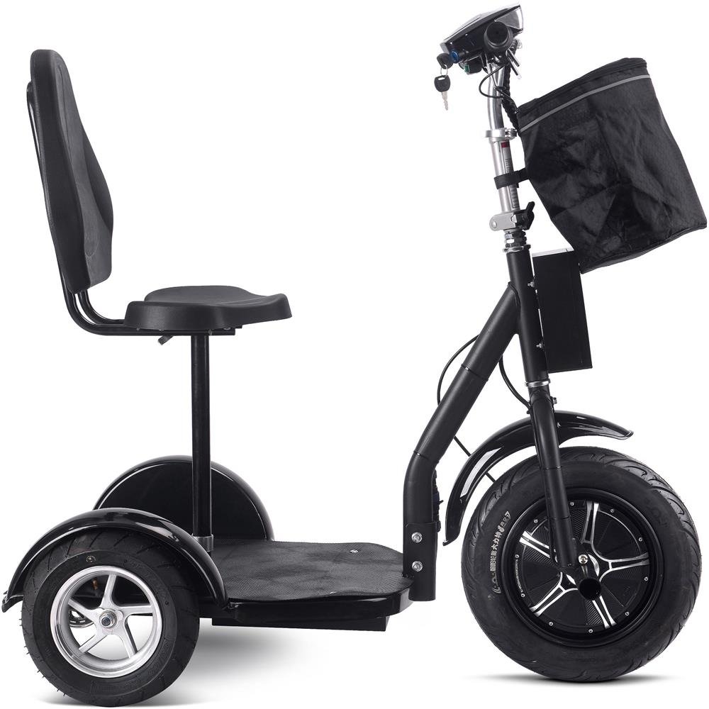 The MotoTec 1000 Watt Electric Powered Trike aka Personal Transporter is a three wheel electric scooter that you can ride while sitting or standing, this makes it very convenient for use at events, security and warehouse floor operations or for just plain fun! It’s like a three wheel Segway but at a fraction of the price! Powered by a 1000 watt front wheel hub motor with speeds up to 28 miles per hour. It can achieve a 20-25 mile range on a full charge with it’s light weight Lithium Battery Pack. It features a 16″ pneumatic front tire, two 12″ pneumatic rear tires, a removable seat with backrest. This personal transporter is easy-to-operate with a twist throttle and front drum brake. Comes standard with key, foot pegs, battery meter, front LED head light and carrying basket.