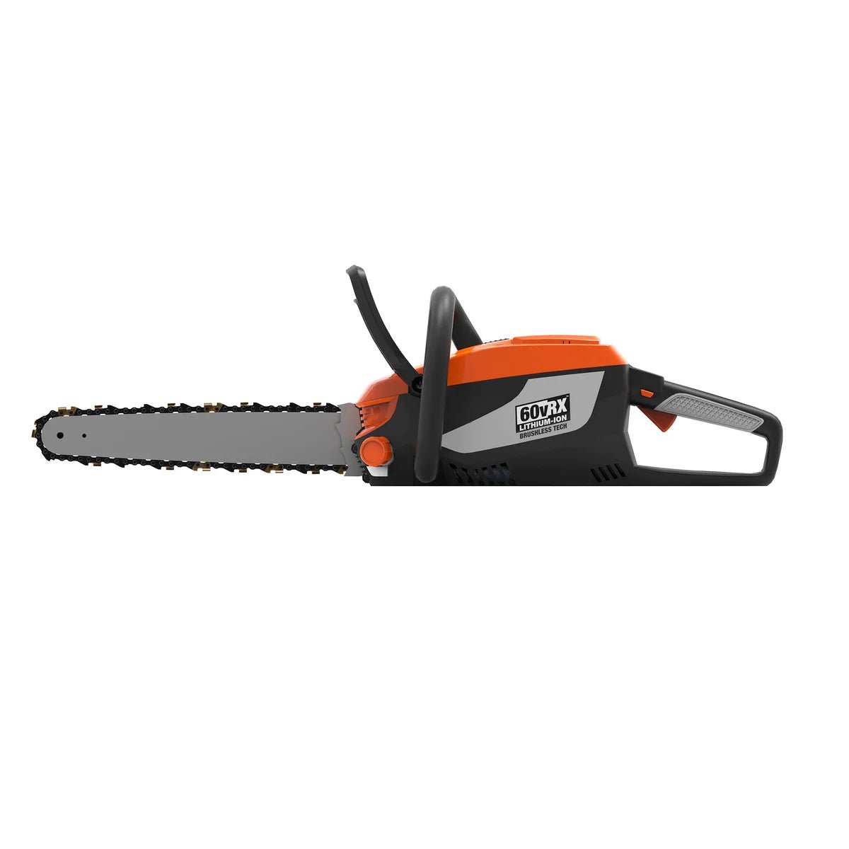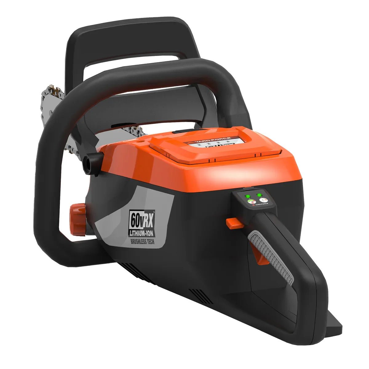 The Yard Force YF60VRX 16″ chainsaw has the power and performance to cut hard and soft wood with the performance of a gas-powered chainsaw and the convenience of a lithium-ion battery. Starting and stopping is quick and easy with the push-button control on the top of the handle. The Oregon bar and chain are manufactured to exacting specifications using the highest quality materials. Features an automatic chain and bar oiler for convenience and extended life.