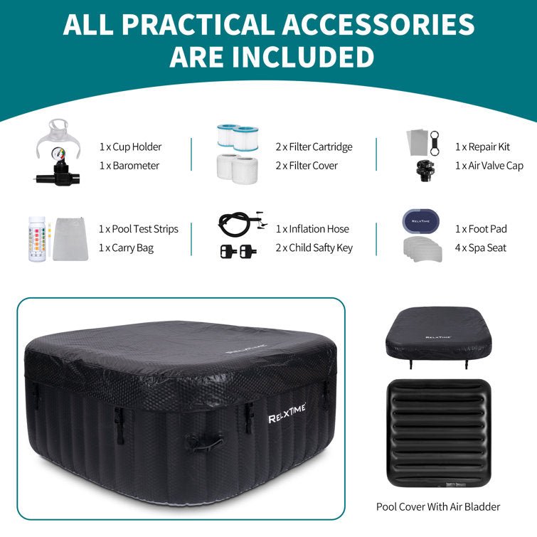 • Enough accessories – 1 pool cover, 4 seat cushions, 1 drainage adapter, 2 filter cartridges & 2 covers, 1 cup holder, 20 strips water testing, 2 PVC patches, 1 spanner, 1 inflation hose, 1 air valve cap, 1x way valve, 1 x barometer, 1 drainage bung, 2 child safety key, 1 power cable, 1 storage bag, 1 instruction manual.